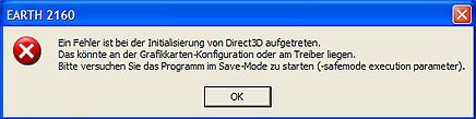 Q: Beim Spielstart erscheint eine Fehlermeldung "Ein Fehler ist bei der Initialisierung von Direct3D aufgetreten. Das könnte an der Grafikkarten-Konfiguration oder am Treiber liegen. Bitte versuchen Sie das Programm im Save-Mode zu starten (-safemode execution parameter)."